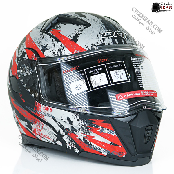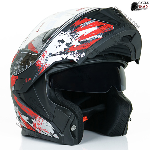 ویژگی ها : دارای پارچه های متحرک و قابل شستوشو _ دارای عینک دودی با قابلیت جمع شدن _ دارای کاور پارچهای _ وزن: 1550 گرم _ جنس بدنه ABS _ فک متحرک _ دارای دریچه ورودی و خروجی هوا، بدون کانال کشی _ دارای استاندارد DOT - سایز لارج دور سر 59 تا 60 سایز ایکس لارج 61 تا 62 سایز دو ایکس لارج 63 و 64