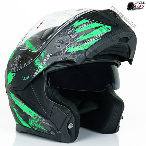 ویژگی ها : دارای پارچه های متحرک و قابل شست‌وشو _ دارای عینک دودی با قابلیت جمع شدن _ دارای کاور پارچه‌ای _ وزن: 1550 گرم _ جنس بدنه ABS _ فک متحرک _ دارای دریچه ورودی و خروجی هوا، بدون کانال کشی _ دارای استاندارد DOT - سایز لارج دور سر 59 تا 60 سایز ایکس لارج 61 تا 62 سایز دو ایکس لارج 63 و 64