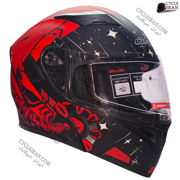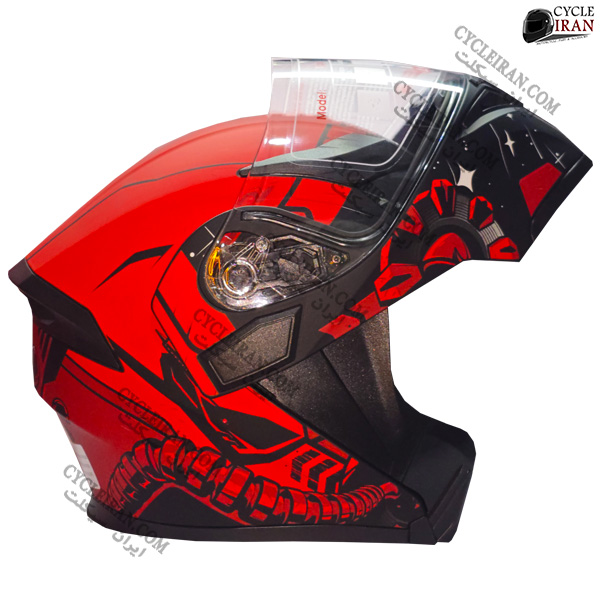 ویژگی ها : دارای پارچه های متحرک و قابل شستوشو _ دارای عینک دودی با قابلیت جمع شدن _ دارای کاور پارچهای _ وزن: 1550 گرم _ جنس بدنه ABS _ فک متحرک _ دارای دریچه ورودی و خروجی هوا، بدون کانال کشی _ دارای استاندارد DOT - سایز لارج دور سر 59 تا 60 سایز ایکس لارج 61 تا 62 سایز دو ایکس لارج 63 و 64