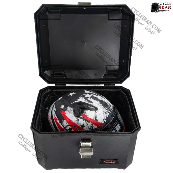 بدنه نشکن و قفل ضد سرقت _ حجم داخلی 65 لیتر _ متحرک و قابل جدا شدن از موتور سیکلت _ جنس بدنه: آلومینیوم با ضخامت دو میلیمتر از بهترین آلومینیوم تولید شده توسط شرکت آلومینیوم اراک _ رنگ بدنه: الکترواستاتیک پودری از نوع سمبادهای برای مقاومت بیشتر در برابر خط و خش _ قفل باکس: با تکنولوژی ضامن جدید آبکاری شده و مقاوم در برابر زنگ زدگی